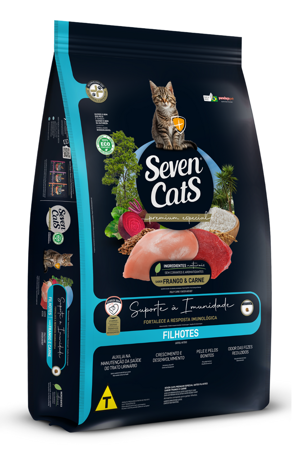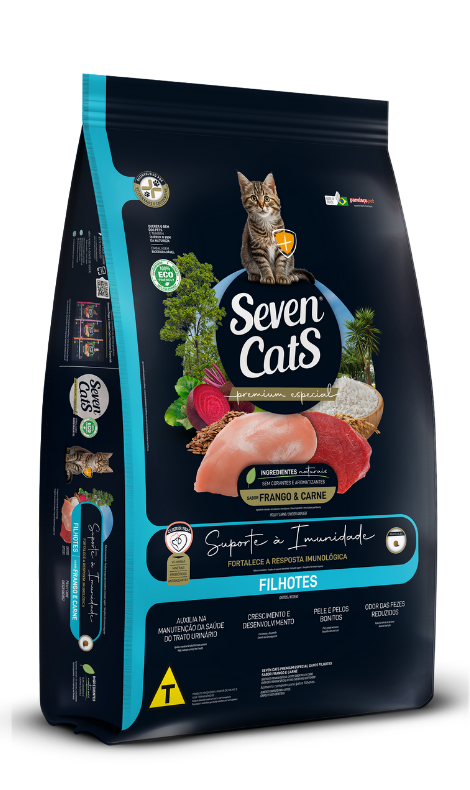 Poultry viscera meal, bovine meat and bone meal, broken rice, corn grain*, corn gluten meal 60*, soybean bran**, flaxseed, dried sugar cane yeast, microalgae biomass (Schizochytrium sp.), poultry oil, yucca extract (min. 0.05%), sodium chloride, vitamins (A, B1, B2, B3, B5, B6, B9, B12, C, D3, E, K3), biotin (vitamin B7), choline, cobalt, copper, iron, iodine, manganese, selenium, zinc, potassium chloride, zinc amino acid chelate, calcium propionate, bentonite, mannan-oligosaccharides - MOS (min. 0.03%), DL-methionine, L-lysine, taurine, hydrolyzed pork liver, acidity regulator additive, antioxidants (BHA and BHT).